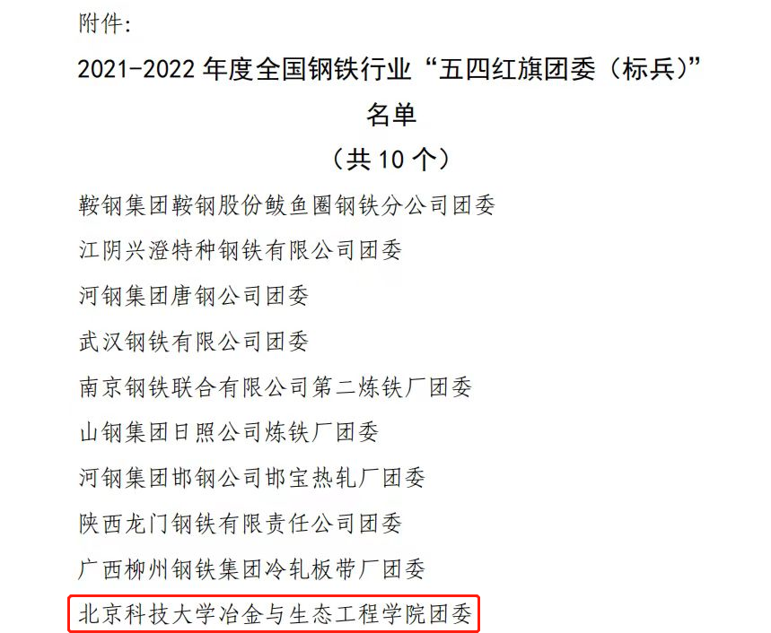 团委荣获2021-2022年度全国钢铁行业“五四红旗团委(标兵)”荣誉称号。