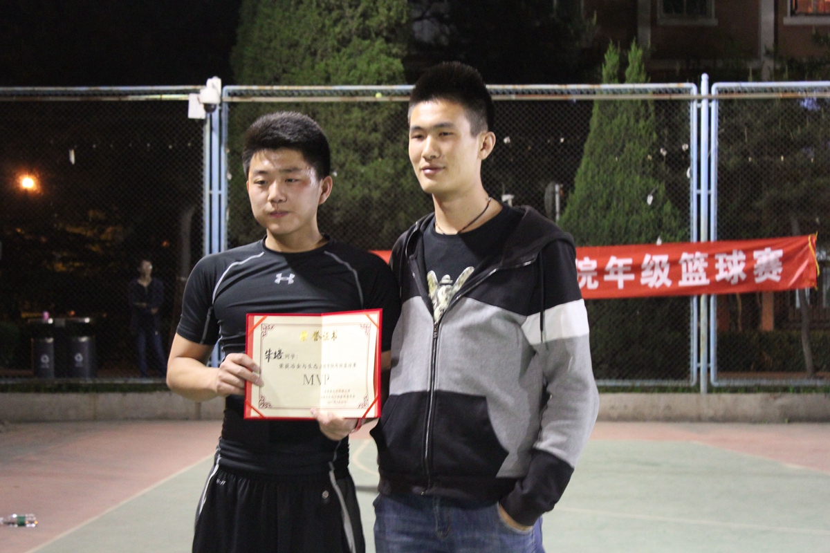 中场休息过后,双方运动员再次回到场上。大二年级的球员调整了球队的战略,并且连续组织了几波进攻,比分再一次缩小,大一球员见势,把球权分散开来,8号球员也发挥了自己强悍的中投能力,帮助球队连续得分。第三节比赛结束,比分停在51:55。大一年级仍领先4分。第四节比赛开始,大二年级仍然保持自己的策略,比分终于被拉平。此时大一球员们明显有些慌乱,连续出现了几个失误。场上比分你追我赶,十分胶着。最终大二球员完成了逆转,以比分63:59险胜对手。大二球员朱培获得本次比赛的MVP荣誉称号。