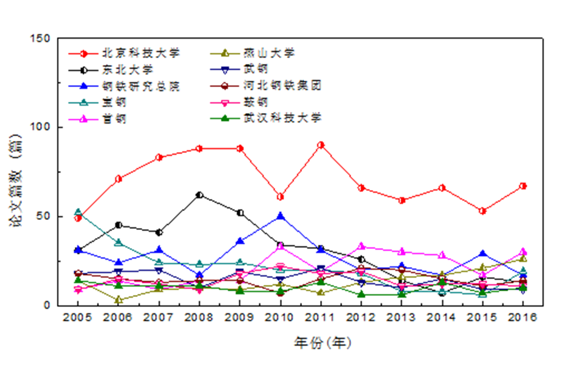 统计,2005―2016年,在钢铁冶金学科国内三大期刊《钢铁》、《炼铁》、《炼钢》上发表的文章,第一作者单位为巨乳a片