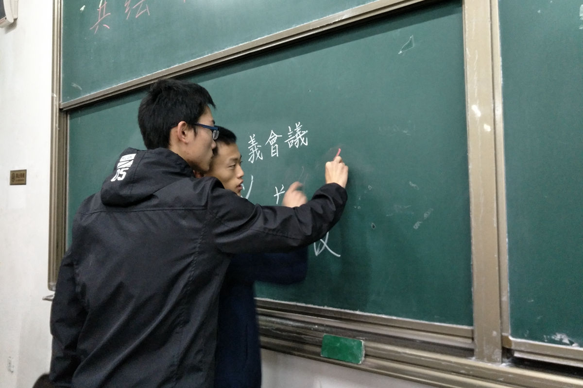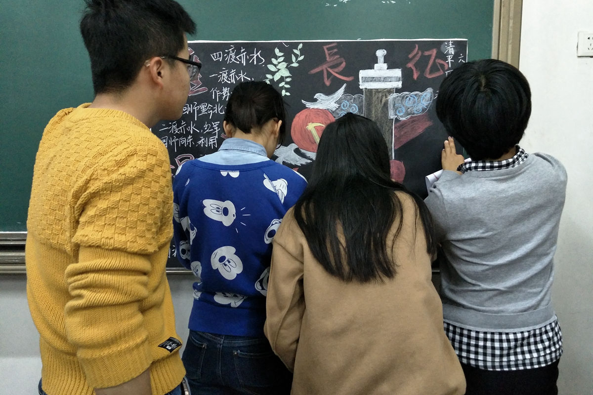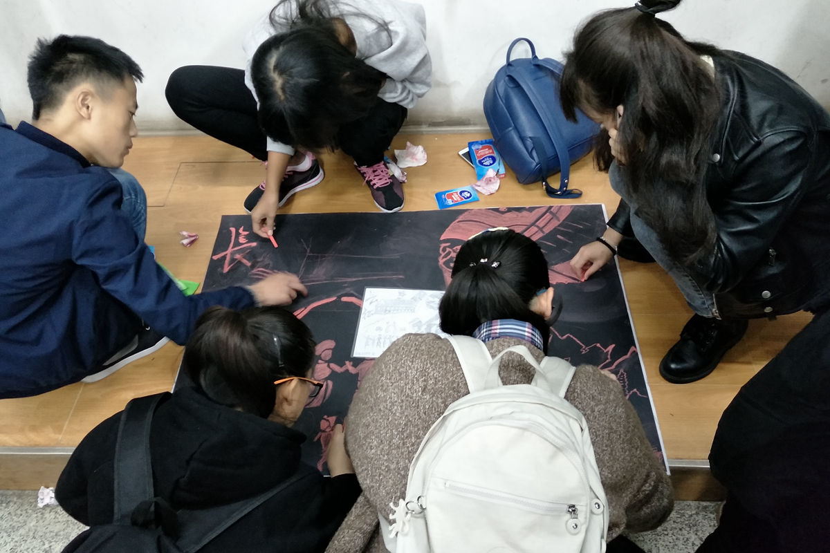 每一个创作都凝聚了班集体的共同智慧,在桌子上作画不够尽兴同学们就把画板转移到地面或者黑板上,大家不断克服条件的限制,完美的完成了一幅幅壮丽的画卷。