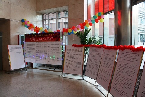 不仅制作了横幅悬挂在院楼门口,大厅内的LED显示屏也滚动播出关于此次选民的注意事项,此外,院办还精心设计了选民榜,将候选人名单张贴在院楼大厅内,醒目大方,使不少教职工及学生驻足浏览。