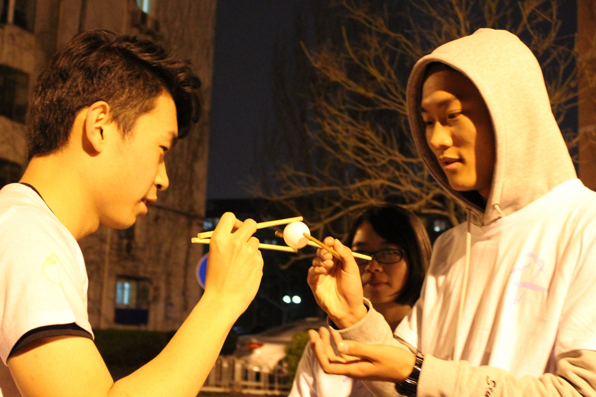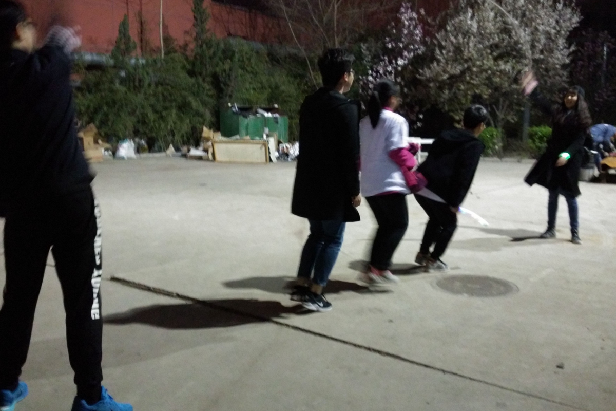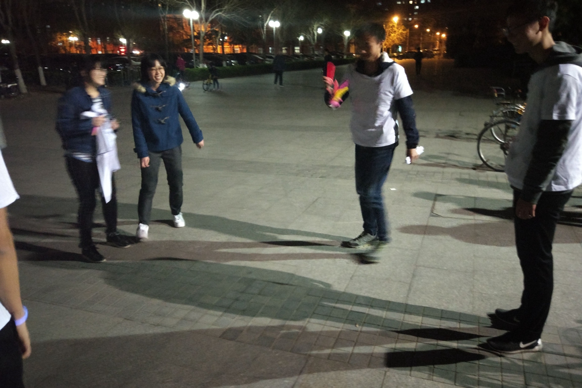 1号站点设置在五环广场,学生会主席邓雨平和巨乳a片主任赵子晗同学担任裁判。参赛选手需要找本队人数的二分之一位路人分组踢毽子,每组至少两名队员,一位路人,连续完成十个即可过关。这项游戏考察了参赛人员身体协调能力和组员默契程度,有利于团学内部建设。2号站点在八九斋东侧花园,裁判是王甜雨和吕彬玉同学。参赛者在回答了“西门的毛主席像伸的是哪只手”这个问题后才可进入游戏环节。游戏是参赛者相互传递乒乓球并且保持球不掉落,有些成员夹着的乒乓球自由落体而有些成员则夹着乒乓球健步如飞。