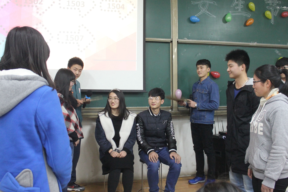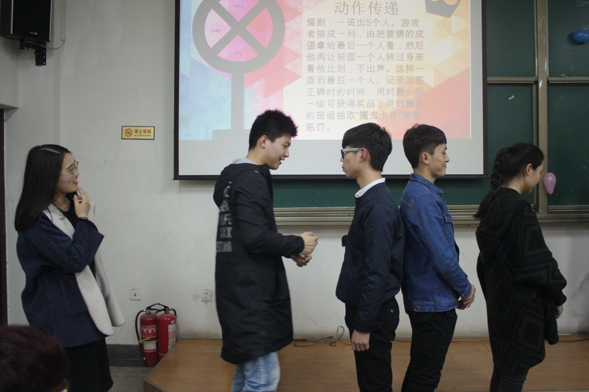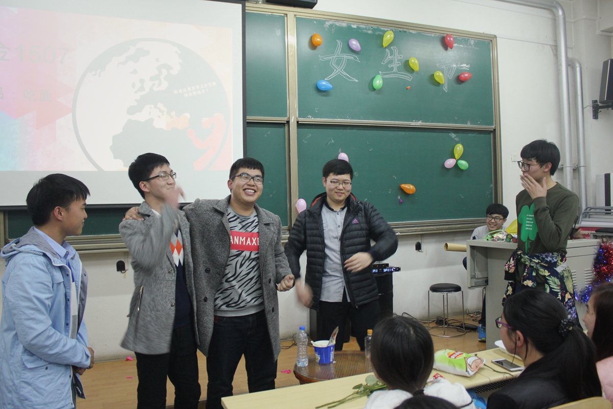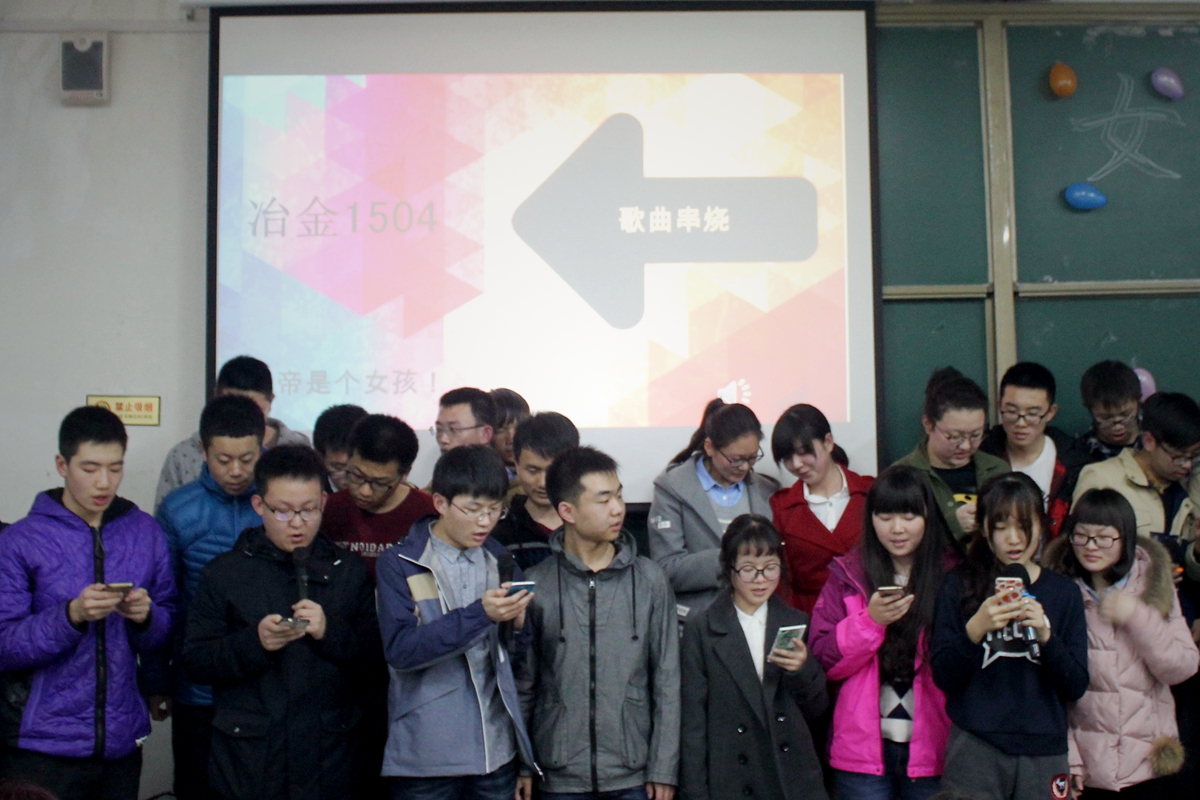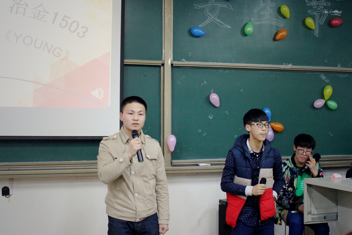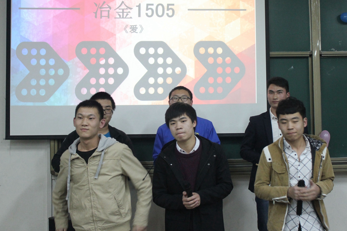 所有女生节日快乐,并带来歌曲串烧,歌声悦耳动听。冶金1502班为同学们表演了精彩的喜剧,风趣幽默地描述了女权至上到男女平等的改变,赢得观众阵阵掌声。在游戏环节中,七支队伍将画饼充饥、三打白骨精、眉目传情等词语表演得惟妙惟肖,引来阵阵笑声。最终冶金1506班代表队获得第一名,冶金1501班抽取了“魔鬼卡片”接受相应的惩罚,两位男同学合吃一根麻花,引来阵阵欢呼。