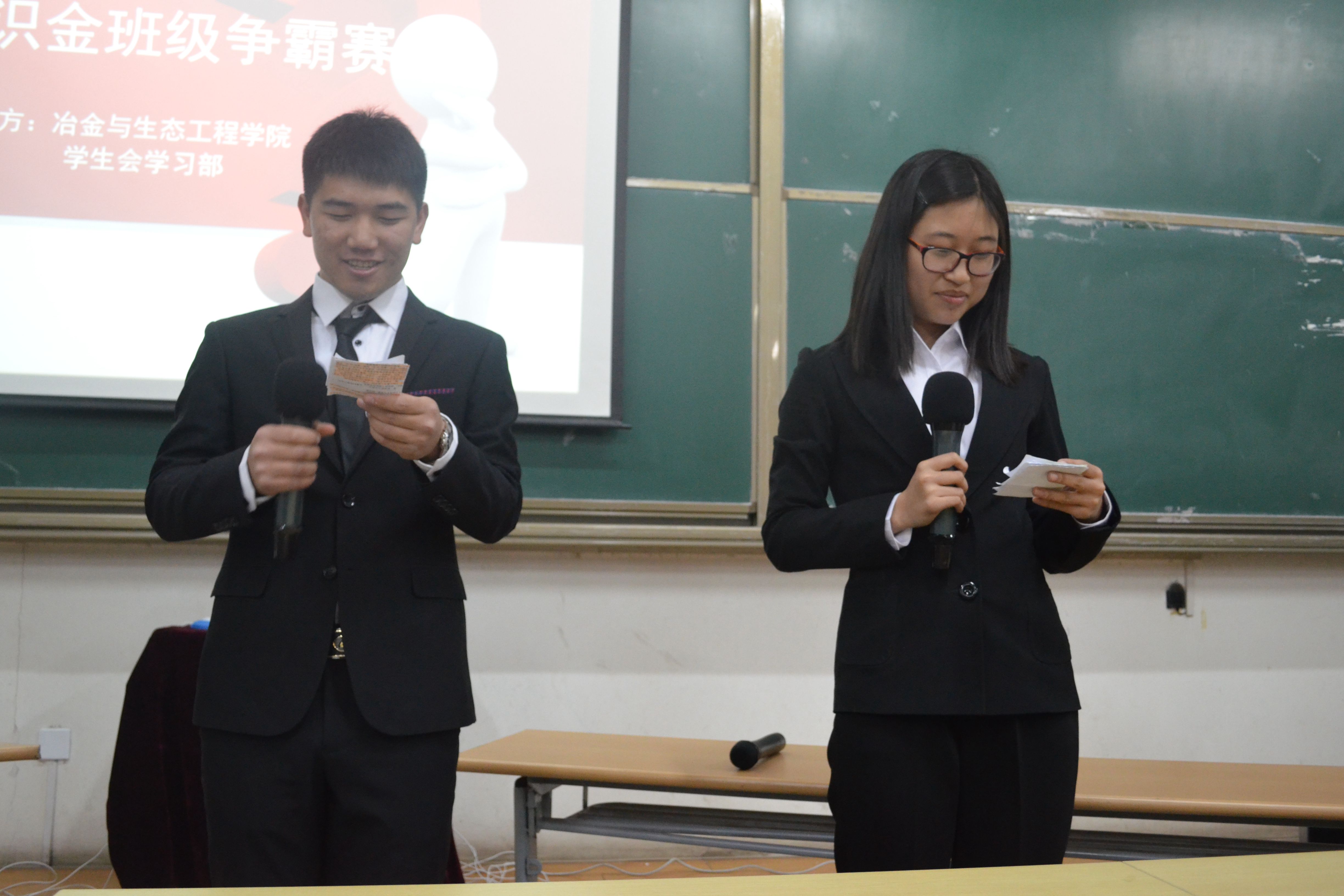 第二届“慧眼识金”班级争霸赛在冶金楼110顺利举行。竞赛题目涵盖冶金专业知识、天文、地理、历史、诗词、音乐、影视、时事政治等各个方面。参加本场比赛的代表队分别是冶金团学代表队,冶金1408班“打鸣的公牛”队,冶金1404班“煎饼果子加鸡蛋”队,冶金1501班“全能蒙队”,冶金1302班“真爱无敌”队,冶金1406班“小飞熊EX”队,冶金1303班“梦航”队,冶金1403班“智者联盟”队八支队伍参加此场比赛。